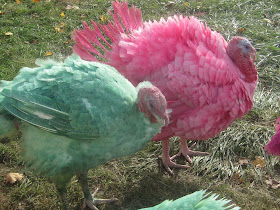 An annual Thanksgiving tradition in our family is to take a trip to the Gozzi Turkey Farm on Rt. 1 in Guilford, Ct. to see these magnificent colored birds. It truly is quite a site. Last year we went at least three times. Here is an article from the NY Times from 1989 that describes the farm in more detail. You can order fresh turkeys for the holidays or just go check out the fabulous colored birds out front. If you live in Ct. or happen to be driving through for the holiday I suggest you make the trip to Gozzi's- It's free and fun!